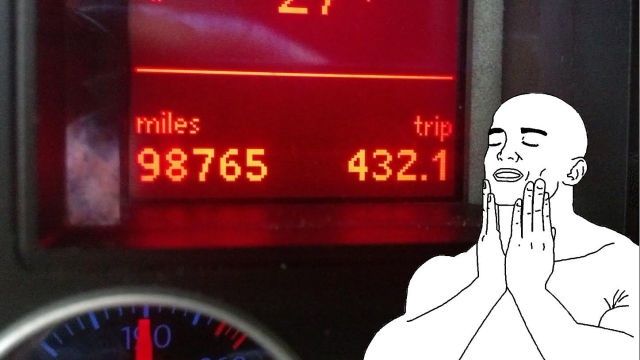 @Badmacstone: Er hat einfach beim Kilometerstand 98332 auf den Resetknopf für den Tageskilometerzähler gedrückt. Dann ist es aber noch ein wenig Glückssache, dass er den abgebildeten km-Stand nicht “verpennt” oder sich in dem Moment, wo der Tageskilometerzähler genau auf 432,1 steht, nicht in einem Überholvorgang auf der Landstraße befindet. Deshalb: Auch meinen großen Respekt! Ich hab’s nicht mal geschafft, bei 10000, 20000, 30000 oder 40000 meinen km-Zähler zu fotografieren, weil ich z.B. auf der Autobahn war, und als ich das nächste Mal auf den Zähler schaute, da waren’s dann schon wieder 30002 km.