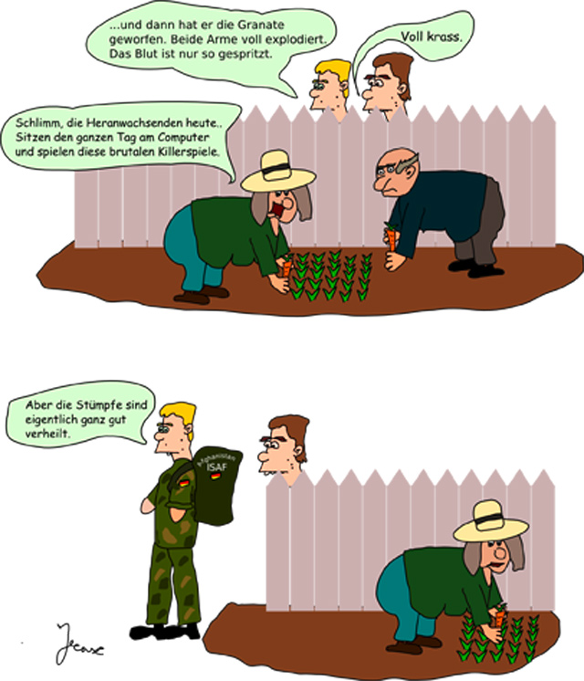 die oma denkt der typ würde nur vorm pc hocken und killerspiele spielen, stattdessen hat er sein arsch in nem krieg riskiert und beide arme verloren.