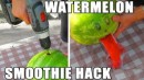 all you need is a watermelon, a coat hanger and a drill. First thing to do: cut a hole. [...] cut a plastic cup with scissors ... haben wir da nicht noch ein zwei sachen vergessen?
